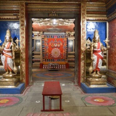 Dressed as Venkatachalapathy, Panduranga strikes a regal pose. Along with him, Alarmelmangai Thaayar (Padmavati) is seated in a divine posture. Having the darshan of the Lord in the form of Lord Venkatachalapathi and Alarmelmangai Thaayar is a blissful experience.