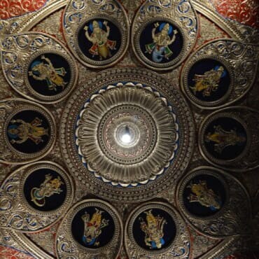 From the MahaMandapam we enter the sanctum sanctorum which consists of two parts, the Ardha Mandapam and the GarbaGriham. Inside the Ardha Mandapam or the middle Mandapam, the ceiling is adorned with fibre glass paintings of Lord Krishna and the depiction of the Dasavathara.